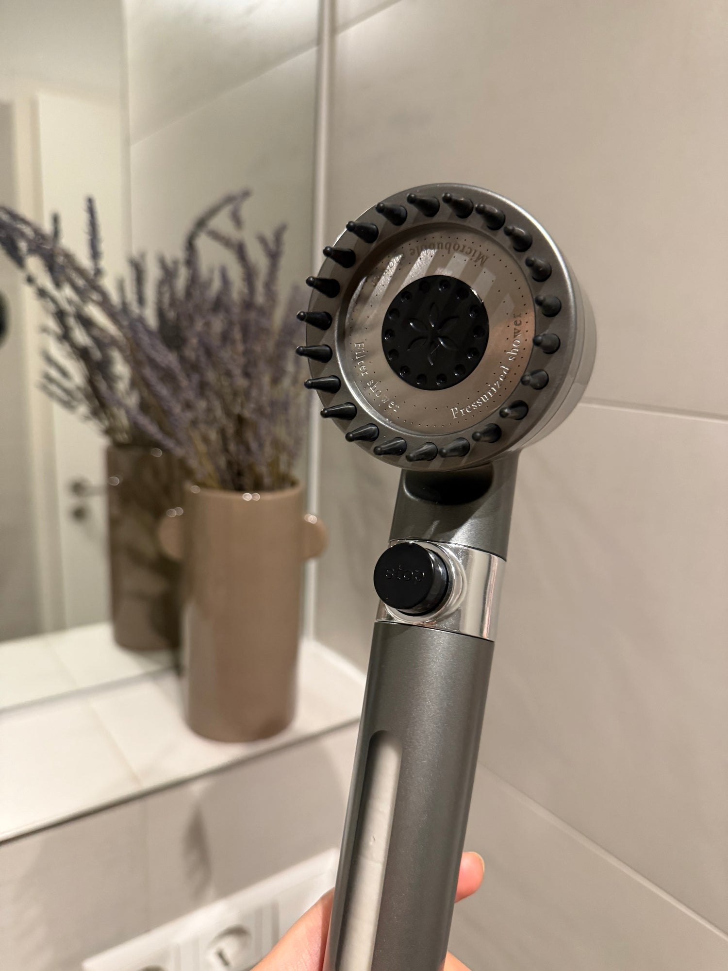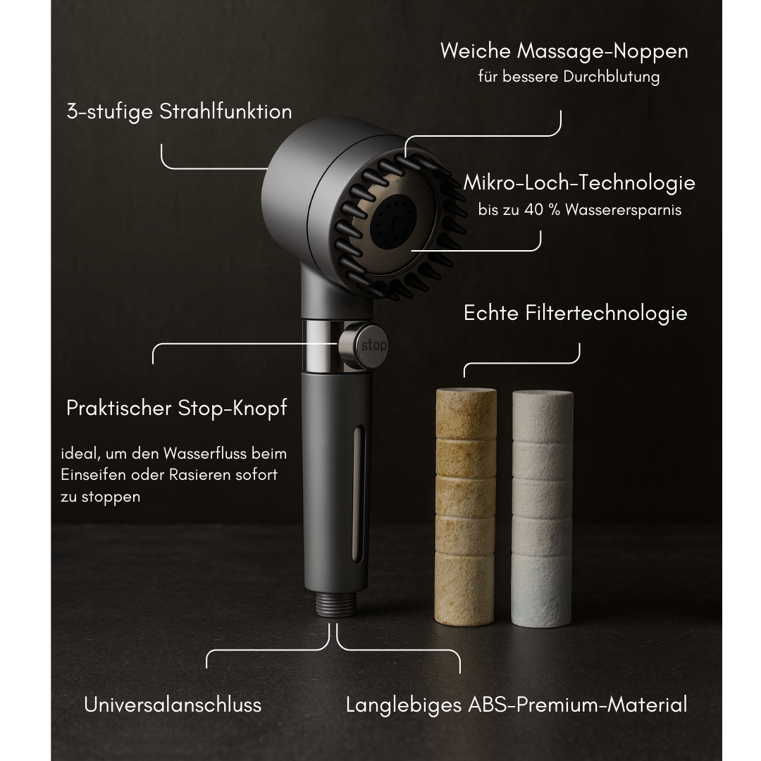 Der Lynero™ AquaPro 2.0 Duschkopf verbindet leistungsstarke Mikro-Loch-Technologie mit echter Filterwirkung – für spürbar weicheres Wasser, stärkeren Druck und ein angenehmes Haut- und Haargefühl. Weiche Massage-Noppen, langlebige Materialien und ein praktischer Stop-Knopf machen jede Dusche effizienter, entspannter und deutlich hochwertiger.
